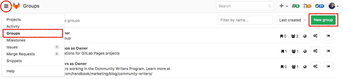 john; his profile will be accessed underhttps://gitlab.example.com/john - John creates a group for his team with the groupname