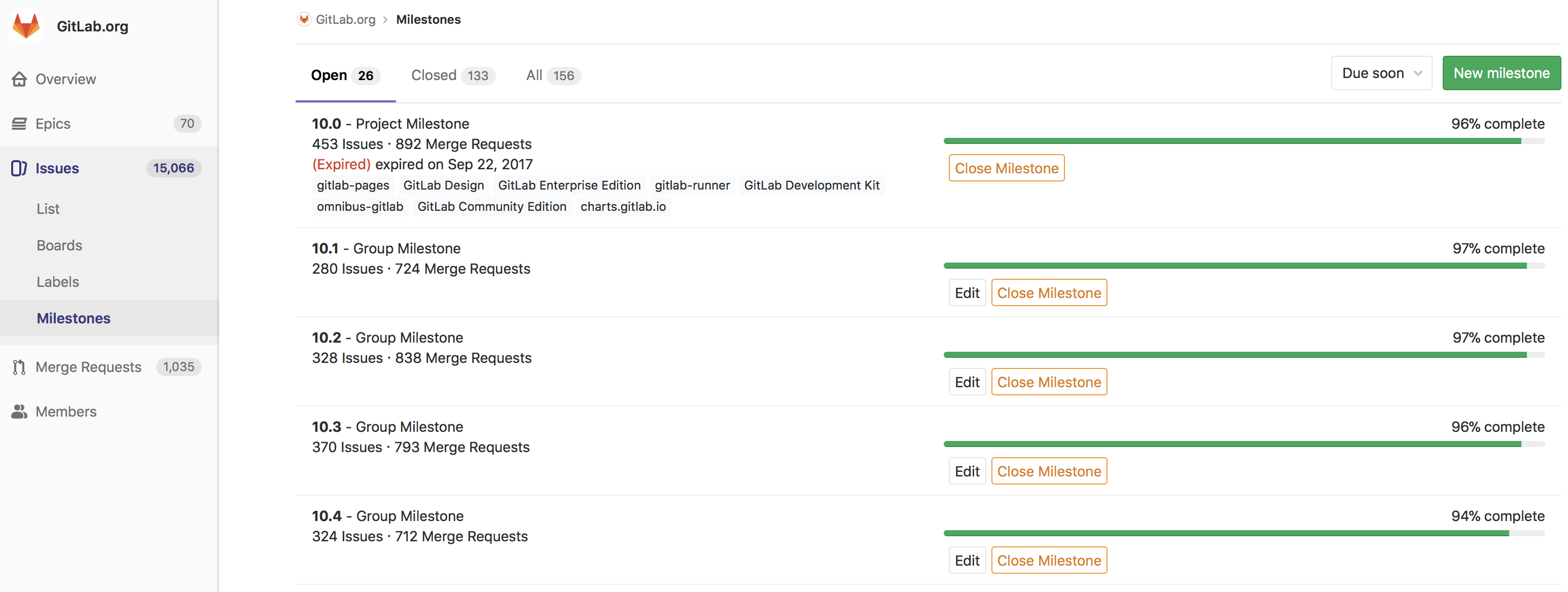 Note: Not all features on the project milestone view are available on the group milestone view. If you promote a project milestone to a group milestone, you will lose these features. See Milestone view to see which features are missing from the group milestone view.