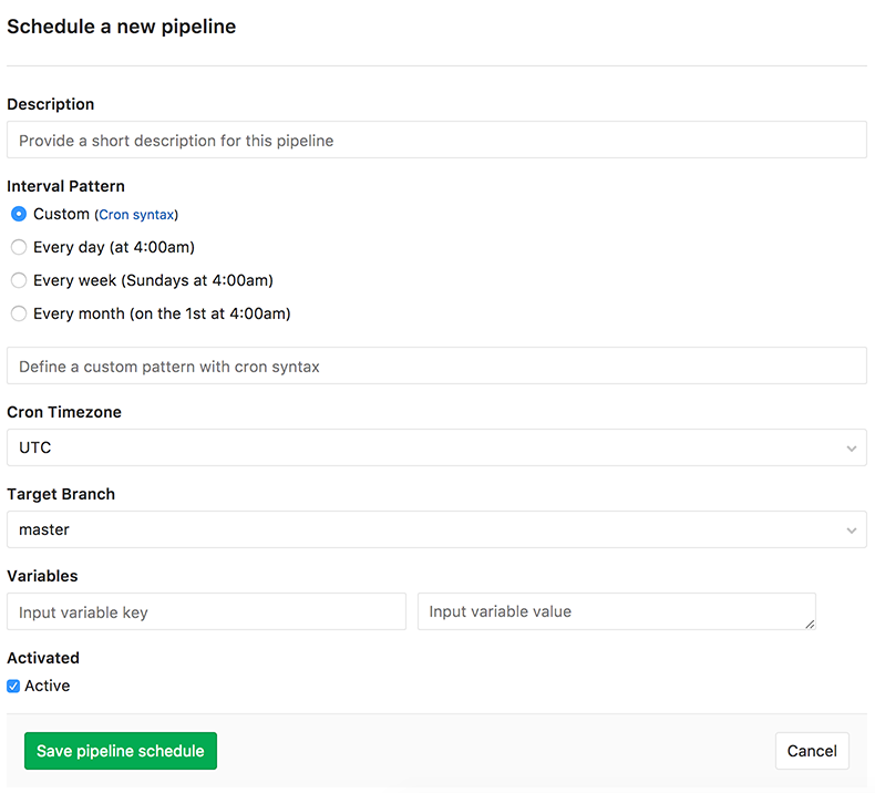 - Navigate to your project's CI / CD ➔ Schedules and click the New Schedule button.